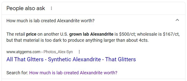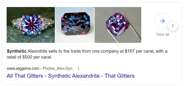 In general, OUR Synthetic Alexandrite pricing is approximately 50% to 75+% off (depends on the lab - Russian vs. U.S. Lab Grown) the expected prices offered to the Retail Public based on a major supplier to the public ($500/ct). Our pricing is typically $20-$250/ct depending on the size, shape, cutting and lab of origin.