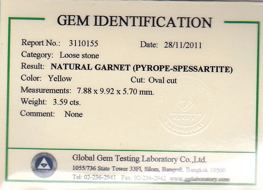 Pyrope-Spessartine Garnet. The color is a yellow with a hint of orange. The color