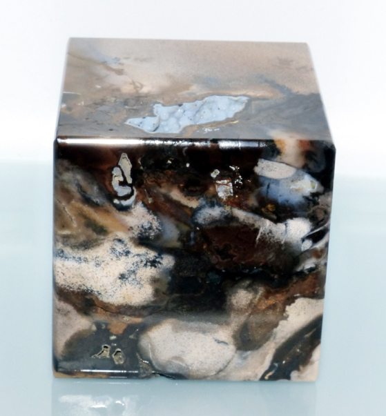 Large Polished Cube of Moss Agate with pockets of Chalcedony Druzy. Measures 3-1/8 inches on sides. From the Sharly Mine, Bek Pakdala Desert in Karaganda Oblast in Kazakhstan. (rrstn-19-01) $1,100 |