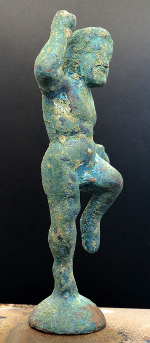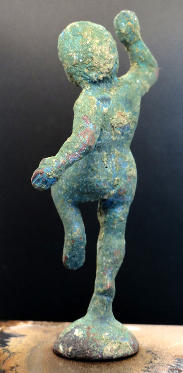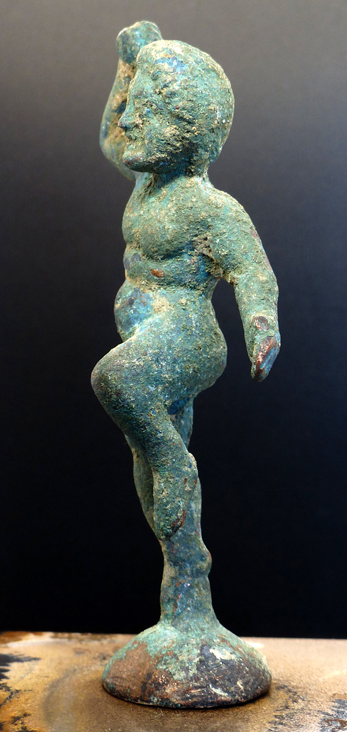 Roman Bronze (approx. 300BC). Said to depict Cupid, but posssibly a Roman athlete playing the ball game of Harpastum, as one can clearly see what looks like a ball in the palm of his right hand. Found in Northern Jordan back in the 1980s along with some other small bronzes. Measures 4-1/2 inches high. (ja-19-04) $1,975 |