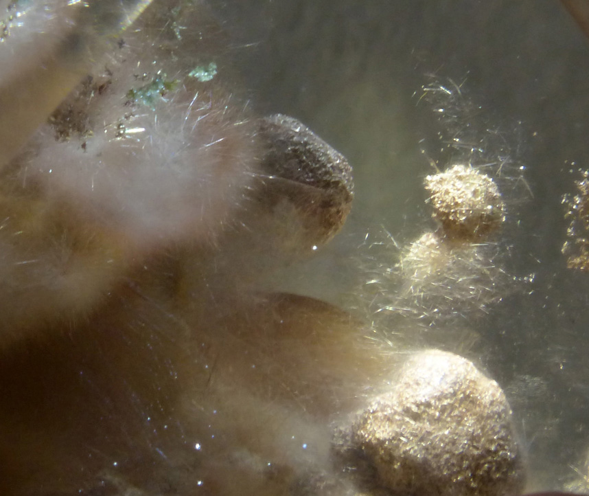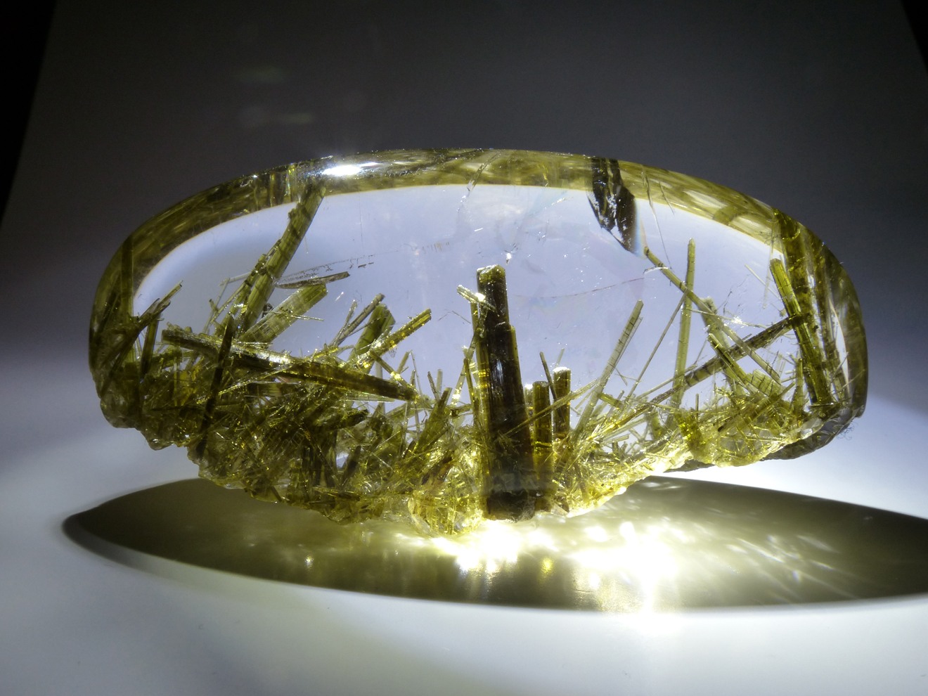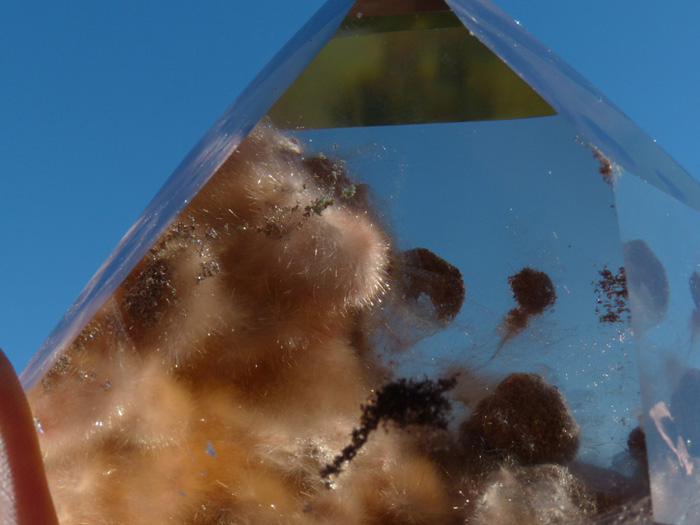 Large 2,710+ct Quartz Crystal with beautiful inclusions including several sprays of crystals. Surfaces have been polished to allow viewing from all the natural crystal faces. Would look beautiful on a lit base or perhaps on a lit custom-made bronze base with hand-applied patina to match the color of the inclusions! We know an artist that can be contacted to create a custom bronze lit base! (tccl-18-01) $1,500. |