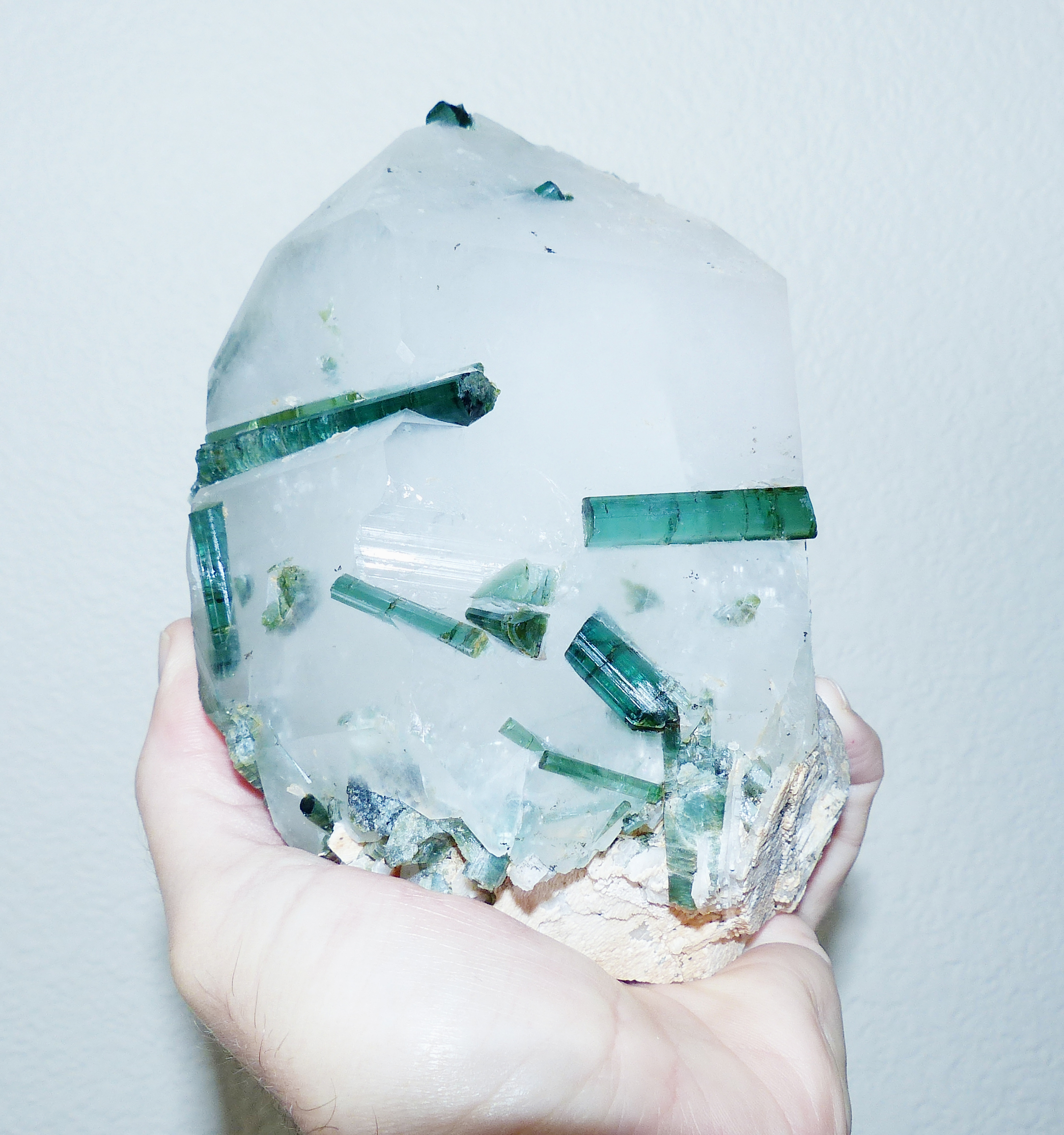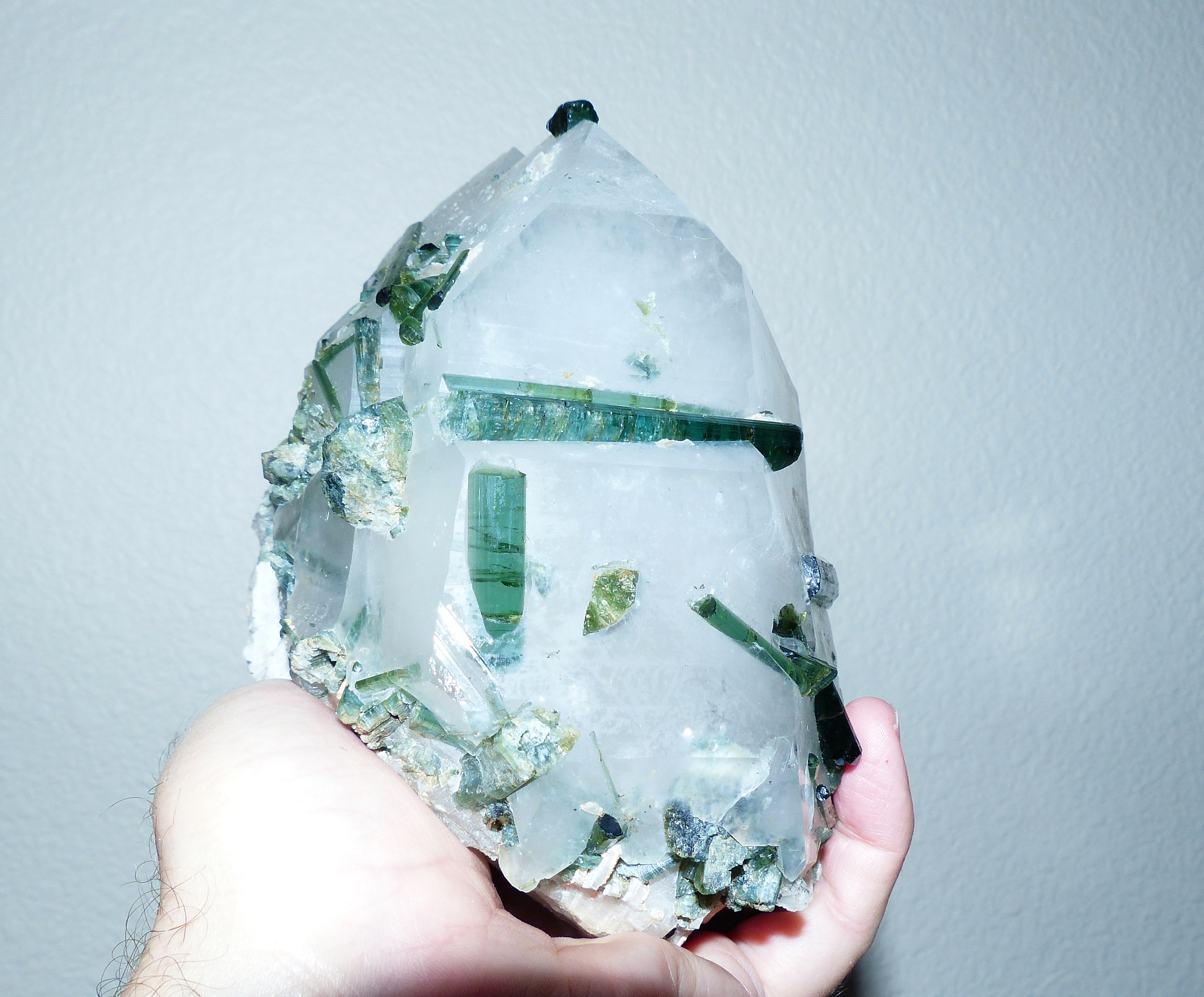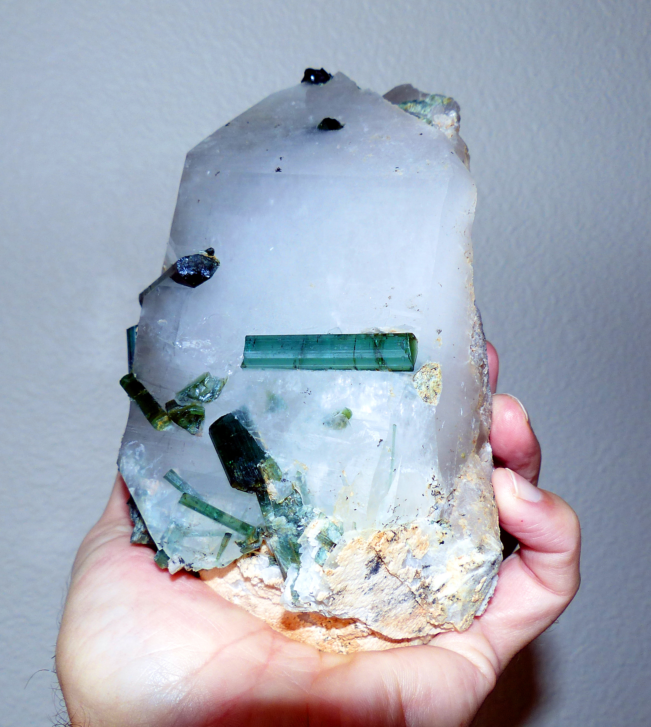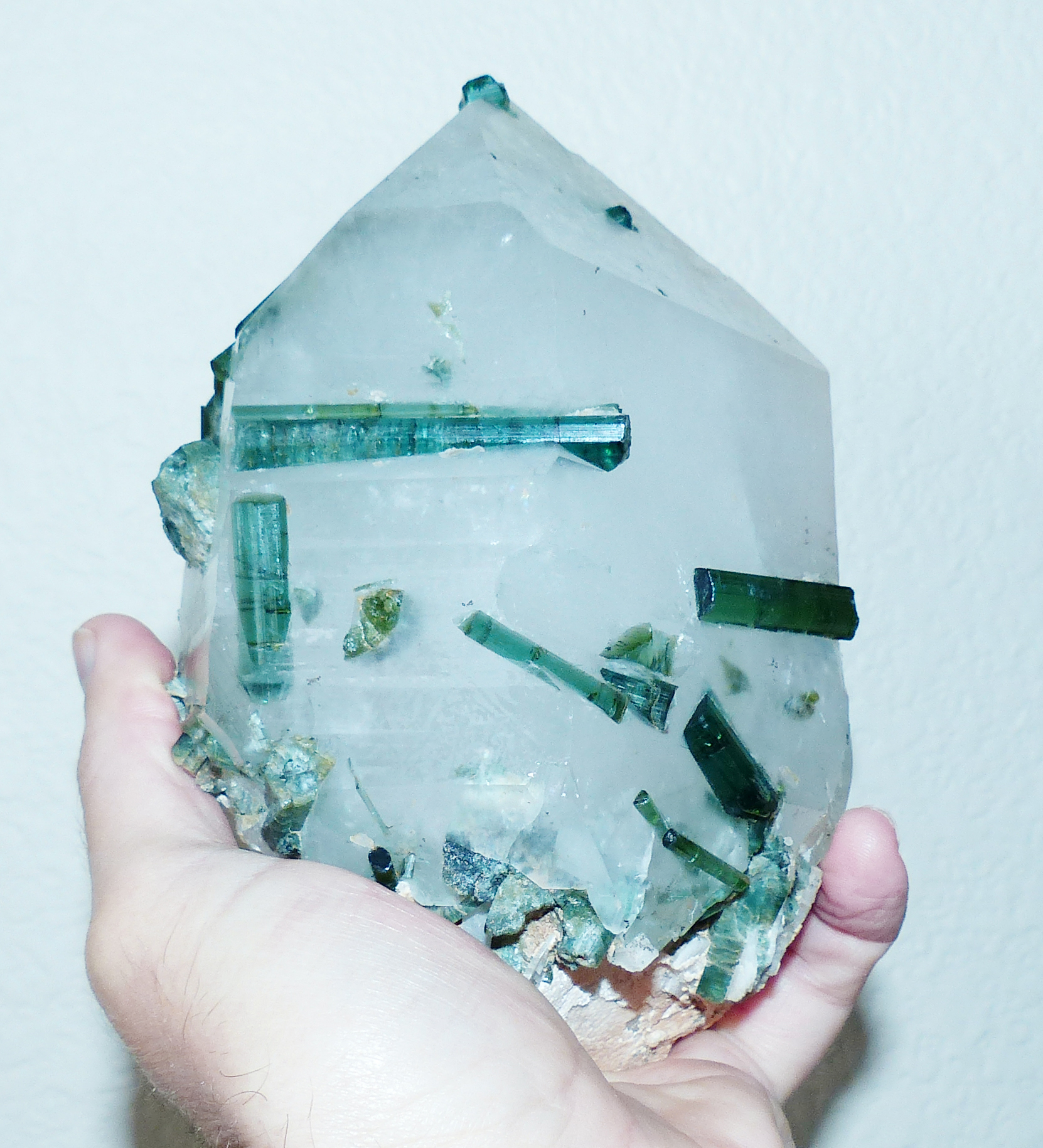 Large Double-Terminated Quartz Crystal with numerous transparent green to blue Tourmaline crystals - approx 6-1/2" high. From the Naipa Mine, Alto Ligonha, Zambezia Province of Mozambique. The first photo shows the two terminations of the Quartz at the top, and a larger photo of this image is available below. Other photos below show the specimen as it is rotated, to show the large number of Tourmalines that are scattered on the surface, with many being able to be seen imbedded in the Quartz itself, and more are probably totally hidden inside. Unsual for such transparent crystals, and the color is also very good from green, to green blue to blue. This piece has a lot of check marks for specimens of Quartz with Tourmaline growing on its surface and internally as the quartz grew around the Tourmaline crystals that were originally on the surface of the Quartz but were engulfed by the Quartz as it grew! (jrod-19-01b) $4,200. |