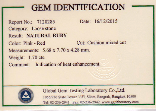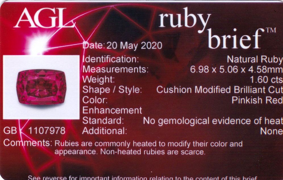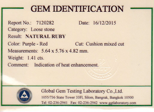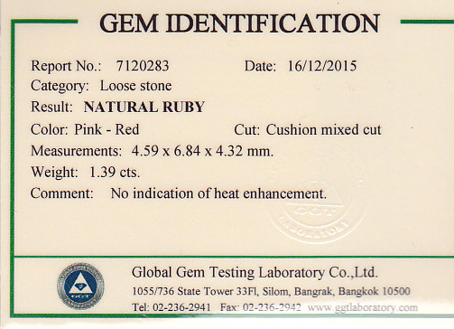 Unheated 1.39ct Cushion Shaped Ruby of a Pinkish Red color. (egaj-15-30) $10,842 - View Cert |