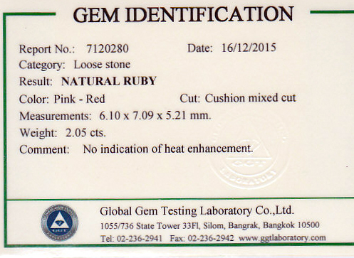 2.05ct Unheated Ruby, Cushion; Red with subtle overtones. Photo doesn't do the gemstone's beauty/color any justice. (egaj-15-03) $20,050 - View Cert |