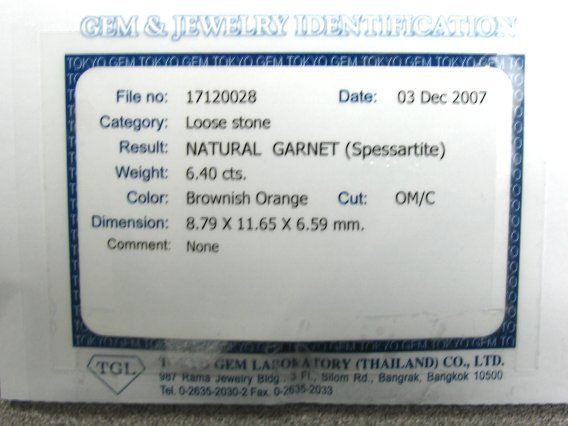 Certed 6.40ct Oval Spessarite, Good Orange. (11.65x8.79x6.59mm) (kaek-07-03) $4800 |