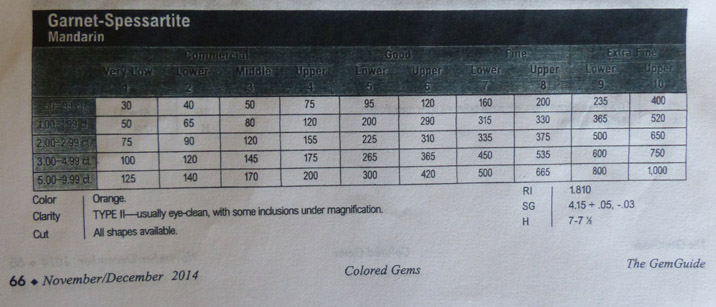 The Orange Spessartites described in the article above wholesales for approximately $400-800/ct in 3+ct sizes (2010 timeframe), which is the smallest that All That Glitters typically purchases. Below is the wholesale pricing for Mandarin Orange Spessartite, Nov-Dec 2014, from The Guide.
