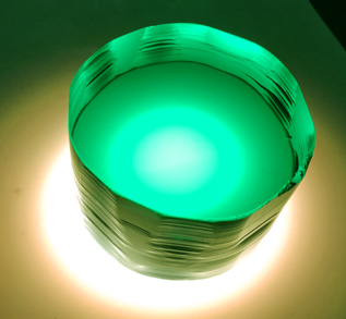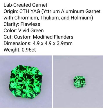 | This image of a faceted CTH YAG was found online. We have yet to facet our CTH YAG, but have done one of the Chromium YAGs - and can't tell the difference between the Faceted Cr YAG and the image of the CTH YAG. Both are vivid green and are ruby red under the Chelsea Filter indicating the presence of Chromium as expected. |